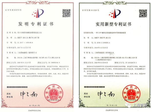 近日,我公司申请的《用于市政管线铺设的管道连接方法》和《一种CIPP翻转法管道修复材料弯转辅助装置》获得国家发明专利授权,专利号分别为ZL201711446148.8和ZL201822190200.4。